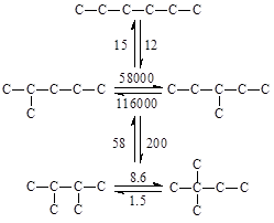 Относительные скорости взаимных превращений углеводородов в процессе скелетной изомеризации отражают более быстрое изменение положения третичного атома, чем превращения вторичного в третичный: