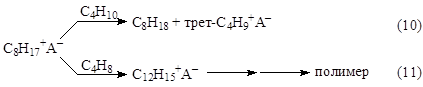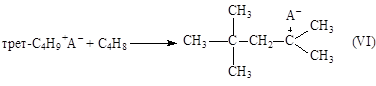 Карбкатион (VI) C8H17+ взаимодействует с изо-C4H10, отрывает от него Н– и превращается в изооктан C8H18 (целевой продукт реакции). Нежелательный процесс – дальнейшее присоединение олефина с последующей полимеризацией.