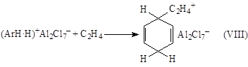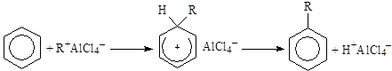 который также может переносить протон на олефин с образованием R+AlCl4–. Реакция карбкатиона CH3CH2+ или (СН3)2СН+ с бензолом и приводит к реакции алкилирования ArH.