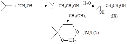 Оба продукта при дегидратации (IX) или отщеплении метиленгликоля (формальдегидгидрата) (X) образуют изопрен, однако, второй путь эффективнее – ДМД легко выделяется из реакционной среды и легко отщепляет CH2(OH)2 (200оС, кислотные катализаторы). ДМД является также хорошим полярным растворителем.