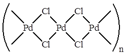 Рассмотрим, например, Вакер-процесс (окисление этилена в ацетальдегид), который протекает в присутствии катализатора PdCl2/CuCl2. На самом деле PdCl2 является линейным полимером, в котором атомы металла связаны хлоридными мостиками: