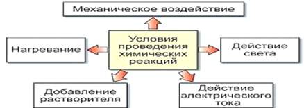 Выделим признаки и условия химических реакций (рис.1, 2).