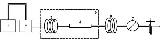 В данной установке дистиллированная дегазированная вода из сосуда 1 подается в насос высокого давления 2, обеспечивающий расход в системе от 0,1 до 10,0 см3/мин при давлении до 40,0 МПа. Из насоса 2 вода поступает в капилляр предварительного нагрева воды 3 и экстрактор 4, помещенные в термостат 5. Экстрактор 4 выполнен в виде колонки из нержавеющей стали длиной 250 мм и внутренним диаметром 10 мм. На выходе из экстрактора 4 установлен капилляр 6, охлаждаемый до Т = 20°С. Для контроля давления в системе установлен образцовый манометр 7 и регулятор давления 8.