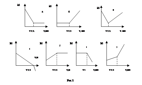 4. Электрохимически активны как определяемое вещество, так и титрант, причем одно восстанавливается на электроде, другое - окисляется. Например, титрование соли Fe3+ раствором TiCl3 при значении потенциала ртутного электрода, равном -0,25В. Точка эквивалентности обнаруживается вследствие различия угла наклона прямых id - v мл реагента, описывающих изменение тока до и после момента эквивалентности; это связано, с различным числом электронов, принимающих участие в электродных реакциях определяемого вещества и титранта, а также с различием в коэффициентах диффузии этих веществ (рис.1г). В приведенном примере до момента эквивалентности на электроде восстанавливаются ионы Fe3+, величина предельного тока пропорциональна концентрации соли Fe3+ в растворе. После момента эквивалентности на электроде протекает процесс окисления соли титана (III), величина предельного тока пропорциональна концентрации последней в растворе.