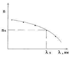 При визуальном качественном АЭА строят дисперсионную кривую (рис.2.3.1) используемого прибора (стилоскопа, стилометра), т.е. градуировочный график прибора, выражающий зависимость между показаниями его отсчётного барабана и длиной волны линии в эталонном спектре n = f () (меди, железа и др.). Затем поочерёдно фиксируют все линии в спектре пробы анализируемого |