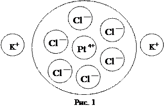 Например, в комплексной соли K2[PtCl6], схематическое строение которой показано на рис. 1, комплексообразователем является ион четырехвалентной платины, аддендами – ионы хлора, а во внешней координационной сфере находятся ионы калия.