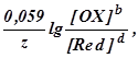 Зависимость редокс-потенциала E(OX/Red) от концентрации и температуры передается уравнением Нернста: