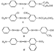 По химическомустроению дисперсные красители – главным образом, азокрасители и антрахиноновые красители, реже – стириловые, хинофталоновые красители, нитродифениламины, ароиленимидазолы, антрапиридоны. Дисперсные азокрасители обеспечивают гамму цветов от желтого до темно-синего. В основном представлены моноазокрасителями – производными 4-аминоазобензола, дающими окраски оранжевых, красных, фиолетовых, темно-синих цветов, например, алый Ж (I) и бордо 2С (II). Получение широкой цветовой гаммы достигается изменением характера и положения заместителей в молекуле. Большинство моноазокрасителей содержит (в остатке диазосоставляющей) в параположении к азогруппе NO2 -гpyппy, углубляющую цвет. Углублению цвета способствует также введение электроноакцепторных заместителей в положения 2 или 2,6 к азогруппе или электронодонорных заместителей (алкилов, алкокси- и ациламиногрупп) в остаток азосоставляющей. Электроноакцепторные заместители (CN, ОСОСН3) в алкиламиногруппах азосоставляющей, понижая основность атома N аминогруппы, приводят к повышению цвета. Гидроксиазокрасители (ОН-группа в орто- или параположении к азогруппе) применяют ограниченно для получения цветов от желтого до красного. Более яркие желтые цвета обеспечивают стириловые, хинофталоновые красители, ароиленимидазолы. Практическое значение имеет и небольшое число дисазокрасителей, преимущественно желтого и оранжевого цветов, например, желтый прочный 4К (III). К дисперсным красителям относятся моноазокрасители, содержащие первичные аминогруппы, способные диазотироваться на волокне и сочетаться с азосоставляющими (диазотирующиеся дисперсные красители), например, диазочерный С (IV). Однако, ввиду сложности крашения, эти красители используют редко, главным образом, для получения на ацетатных тканях прочных черных окрасок.