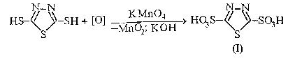 2,5-димеркапто – 1,3,4-тиадиазол ввиду доступности и простоты его синтеза [9] вызывает интерес в плане его структурной модификации с целью получения новых потенциально биологически активных веществ. Окисление 2,5-димеркапто – 1,3,4-тиадиазола водным раствором перманганата калия протекает только по тиольным группам, не затрагивая гетероциклический атом серы, и приводит к образованию 1,3,4-тиадиазол – 2,5-дисульфокислоты (I).