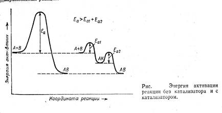 Последнее определение включает два существенных момента: катализатор входит в состав промежуточных соединений, но не фигурирует в стехиометрическом уравнении основной реакции и, следовательно, не влияет на равновесие основной реакции и не расходуется в ней. Катализатор за счет участия в образовании интермедиатов обеспечивает протекание реакции по другому пути, имеющему более низкую наблюдаемую энергию активации, и значит более высокую скорость превращения реагентов в продукты (см. рис. 1).
