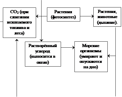 Самый интенсивный биогеохимический цикл – круговорот углерода. В природе углерод существует в двух основных формах – в карбонатах (известняках) и углекислом газе. Содержание последнего в 50 раз больше, чем в атмосфере. Углерод участвует в образовании углеводов, жиров, белков и нуклеиновых кислот.