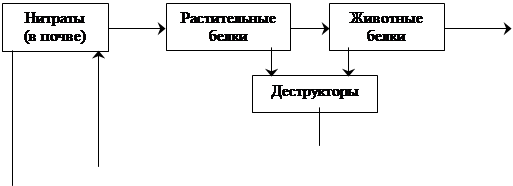 Самые активные потребители азота – бактерии на корневой системе растений семейства бобовых. Каждому виду этих растений присущи свои особые бактерии, которые превращают азот в нитраты. В процессе биологического цикла нитрат-ионы (NO3-) и ионы аммония (NH4+), поглощаемы растениями из почвенной влаги, преобразуются в белки, нуклеиновые кислоты и т.д. Далее образуются отходы в виде погибших организмов, являющихся объектами жизнедеятельности других бактерий и грибов, преобразующих их в аммиак. Так возникает новый цикл круговорота. Существуют организмы, способные превращать аммиак в нитриты, нитраты и в газообразный азот. Основные звенья круговорота азота в биосфере представлены схемой на рис. 3.