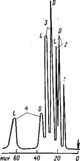 Рис. 1. Хроматограмма рацематов аминокислот, полученная на колонке размером 100Х1 мм (стекло) с асимметрическим полистирольным анионитом (7,5 мкм), подвижная фаза – 0,25 М ацетат натрия и 1,5Х10-3 М ацетат меди, рН=5,2, детектор–УФ (260 нм): 1 – лизин; 2 – аланин; 3 – серии; 4 – лейцин