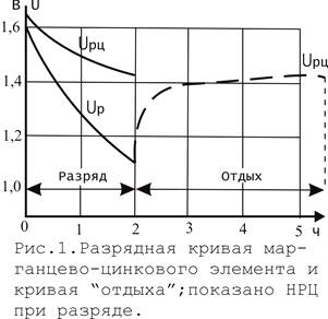 Этими особенностями положительного электрода частично объясняются характерные разрядные свойства марганцевых элементов. Из-за непрерывного изменения потенциала положительного электрода напряжение элемента в ходе разряда существенно падает, особенно при больших токах (рис.1). Одновременно падает значение НРЦ. После отключения тока напряжение в первый момент подскакивает до промежуточного значения (исчезновение омического падения напряжения); после этого НРЦ лишь медленно увеличивается до значения, соответствующего данной степени заряженности. Во время такого «отдыха» происходит выравнивание концентрации (значения у) внутри твердой фазы.