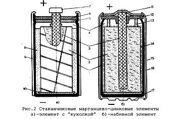В элементах, не входящих в состав батарей, цинковый корпус вставлен в картонный футляр 9 с этикеткой (рис.2, а). В настоящее время в цилиндрических элементах вместо картонного футляра часто используют дополнительный корпус 15 из тонкой стали (рис.2,б). Для изоляции на цинковый стакан надета пластмассовая трубка 16. Крышка 11 и дополнительное донышко 17 удерживаются путем закатки краев корпуса. Прокладка 12 изолирует корпус от крышки и герметизирует элемент. Для образования газовой камеры служит вставка 13. Основные преимущества таких элементов — хорошая герметичность, улучшенная сохраняемость и отсутствие течи электролита. По этим причинам они получили широкое распространение, несмотря на сложность конструкции и повышенную стоимость.
