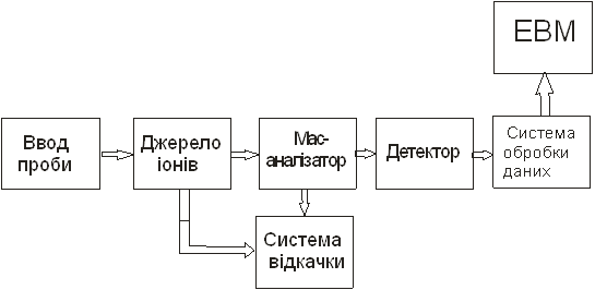 На малюнку 2 зображено блок-схему мас-спектрометра. Мас-спектрометр звичайно містить пристрій для підготовки досліджуваної речовини, іонне джерело, де ця речовина частково іонізується й відбувається формування іонного пучка, мас-аналізатор, у якому відбувається поділ іонів по масах, точніше, по величині відношення маси m іона до його заряду e; приймач іонів, де іонний струм перетвориться в електричний сигнал, що потім підсилюється й реєструється. У пристрій, що реєструє, крім інформації про кількість іонів (іонний струм) , з аналізатора надходить також інформація про масу іонів. Мас-спектрометр містить також системи електричного живлення й пристрій відкачки, що створює і підтримують високий вакуум в джерелі й аналізаторі. Іноді мас-спектрометр з'єднують із ЭОМ для прискорення обчислень.