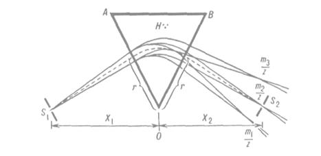 На мал. 3 наведена схема розповсюдженого статичного мас-аналізатора з однорідним магнітним полем. Іони, утворені в іонному джерелі, виходять із щілини шириною S1 у вигляді розбіжного пучка, що у магнітному полі розділяється на пучки іонів з різними величинами відношення маси іона до його електричного заряду: