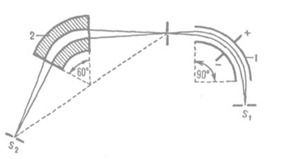 Якби фокусування іонів було ідеальним, то у випадку мас-аналізатора, у якого X1 = X2 (мал. 3), σ1 було б у точності рівним ширині щілини джерела S1. У дійсності σ 1>S1, що зменшує роздільну здатність пристрою. Однією із причин розширення пучка є розброс у кінетичній енергії іонів, що вилітають із іонного джерела. Це в більшій або меншій мірі неминуче для будь-якого іонного джерела. Іншими причинами є: наявність у даного пучка значної розсіюваності, розсіювання іонів в аналізаторі через зіткнення з молекулами залишкового газу, відштовхування іонів у пучку через однойменність їхніх зарядів. Для ослаблення впливу цих факторів застосовують „ похиле входження ” пучка в аналізатор і криволінійні границі магнітного поля. У деяких мас-спектрометрах застосовують неоднорідні магнітні поля, для зменшення розсіювання іонів прагнуть створити в аналізаторі високий вакуум ( 10-8 мм рт. cm. у приладах із середньою й високою величиною R). Для ослаблення впливу розбросу по енергіях застосовують прилади з подвійним фокусуванням, які фокусують на щілину S2 іони з однаковими m/е, що вилітають не тільки по різних напрямках, але й з різними енергіями. Для цього іонний пучок пропускають не тільки через магнітне, але й через електричне поле, що відхиляє частинки (мал. 4).