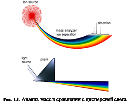 Масс-спектрометр определяет массу молекулы, измеряя отношение массы к заряду (m/z) её иона. Ионы генерируются при потере или получении заряда нейтральными частицами. После образования ионы электростатически направляются в анализатор массы, где они разделяются соответственно своему m/z и, наконец, детектируются. Результатом ионизации молекул, разделения ионов и детектирования ионов является спектр, по которому можно определить молекулярную массу и даже некоторую информацию о строении вещества. Можно провести аналогию между масс-спектрометром и призмой, как показано на рис. 1.1. В призме свет разделяется на компоненты по длинам волн, которые затем определяются оптическим рецептором. Точно так же, в масс-спектрометре сгенерированные ионы разделяются в анализаторе массы, подсчитываются и определяются в детекторе ионов (таких, как, например, электронный умножитель).