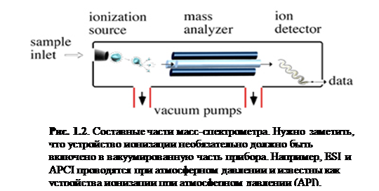 ции, анализатор массы и детектор ионов. Некоторые приборы комбинируют ввод образца и ионизацию, в других объединены анализатор массы и детектор. Однако все молекулы образца претерпевают одинаковые воздействия независимо от конфигурации прибора. Молекулы образца вводятся через систему впуска. Попав внутрь прибора, молекулы преобразуются в ионы в устройстве ионизации, а затем электростатически переносятся в анализатор массы. Ионы затем разделяются соответственно их m/z. Детектор преобразует энергию ионов в электрические сигналы, которые затем поступают в компьютер.