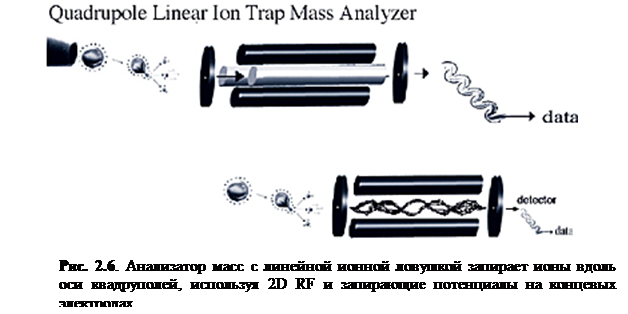 Линейная ионная ловушка отличается от трёхмерной (рис. 2.6) тем, что она запирает ионы вдоль оси квадрупольного анализатора масс, используя двумерное (2D) радиочастотное (RF) поле с потенциалами, приложенными к концевым электродам. Основное преимущество линейной ловушки перед 3D – больший объём анализатора, который сам по себе значительно увеличивает динамический диапазон и улучшает диапазон количественного анализа.