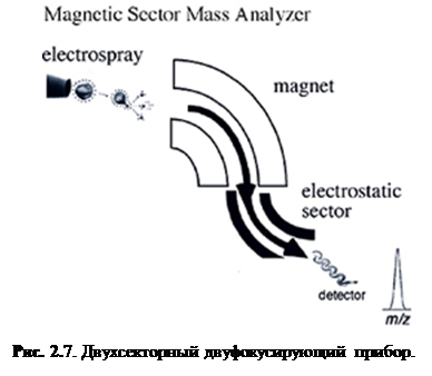 Первые анализаторы масс разделяли ионы при помощи магнитного поля. В магнитом анализе ионы ускоряются в магнитном поле при помощи электрического. Заряженные частицы, движущиеся в магнитно поле, будут двигаться по дуге, радиус которой зависит от скорости ион, силы магнитного поля и m/z иона. Масс-спектр получается сканированием магнитного поля и наблюдением того, как ионы попадают фиксированный точечный детектор. Ограничением магнитных анализаторов является относительно малое разрешение. Чтобы улучшить его, магнитные приборы были модифицированы с добавлением электростатического анализатора, чтобы сфокусировать ионы. Такие приборы называются двухсекторными. Электрический сектор служит как элемент фокусировки кинетической энергии, позволяя только ионам с определённой кинетической энергией проходить через поле, независимо от их m/z отношения. То есть, добавление электрического сектора позволяет только ионам с одинаковой энергией достигать детектора, тем самым уменьшая разброс кинетической энергии, что, в свою очередь, увеличивает разрешение. Нужно отметить, что увеличение разрешения вызывает соответствующее уменьшение чувствительности. Такие двуфокусирующие (рис. 2.7) анализаторы масс используются совместно с ESI, FAB и EI, однако они нешироко используются сейчас, в основном, из-за их больших размеров и успешности времяпролётных, квадрупольных и FTMS анализаторов с ESI и