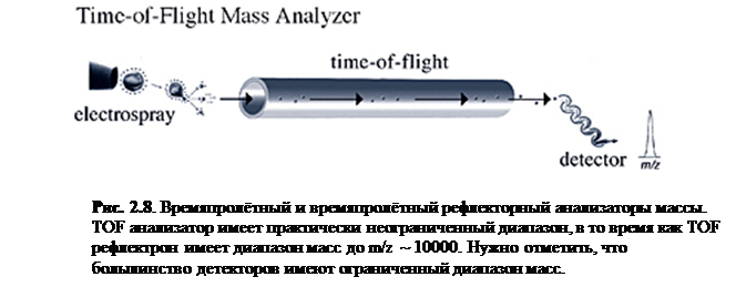 Линейный времяпролётный (TOF) анализатор масс (рис. 2.7) является простейшим анализатором масс. Он пережил возрождение с изобретением MALDI и его текущее применения для электроспрея и даже газовой хроматографии с масс-спектрометрией электронной ионизацией (GC/MS). Времяпролётный анализ основан на ускорении группы ионов по направлению к детектору, при котором всем ионам сообщается одинаковая энергия при помощи ускоряющего потенциала. Так как ионы имеют одинаковую энергию, но разную массу, лёгкие ионы достигают детектора первыми из-за их большей скорости, в то время как тяжёлые ионы летят дольше из-за их большей массы и, соответственно, более низкой скорости. Поэтому анализатор был назван времяпролётным, потому что масса в нём определяется по времени прибытия ионов. Масса, заряд и кинетическая энергия – всё это вносит свой в клад в время прибытия иона к детектору. Так как кинетическая энергия (KE) иона равна ½ mv2, скорость иона может быть представлена как v = d/t = (2KE/m) ½. Ионы проходят расстояние d за время t, а t зависит от m/z. В этом уравнении v = d/t = (2KE/m) ½, принимая z = 1. Другим представлением этого уравнения, более чётко показывающим, как определяется масса, является m=2t2 KE/d2, где KE=const.