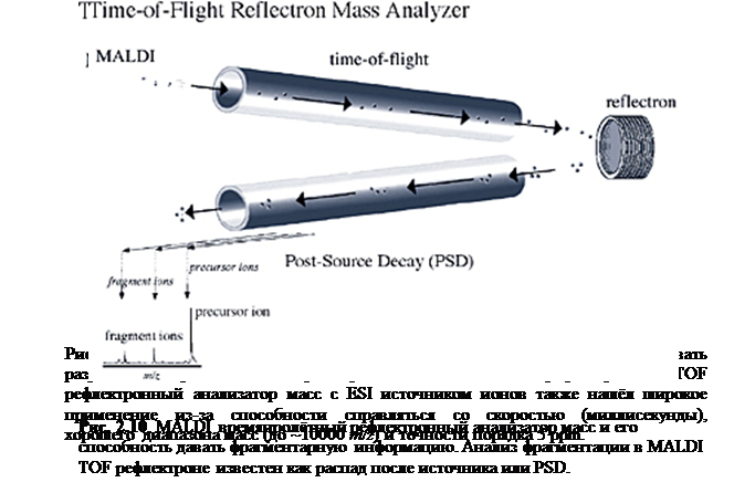 Другим типом тандемного анализа масс, MS/MS, является также возможное комбинирование MALDI и TOF рефлектрона. MS/MS осуществляется с особенности MALDI – фрагментации, которая происходит после ионизации, или распадом после источника (PSD). Времяпролётные приборы сами по себе не разделяют пост-ионизационные фрагментарные ионы от одного и того же иона-прекурсора, потому что и прекурсор, и фрагментарные ионы имеют одинаковую скорость и поэтому достигают детектора в одно и то же время. Рефлектрон даёт преимущество в том, что фрагментарные ионы имеют разную кинетические энергии и разделяются на основании того, как глубоко ионы проникают в поле рефлектрона, тем самым давая спектр фрагментарных ионов (рис. 2.9 и 2.10).