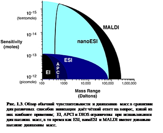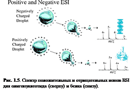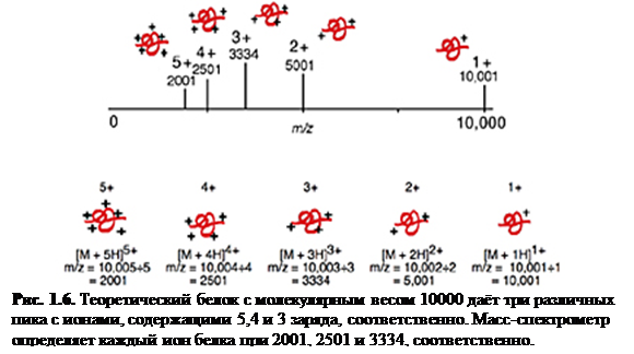 Многократная зарядка: белок с массой 10000 дальтон и его теоретический масс-спектр с зарядами до +5 показаны на рис. 1.8. Масса белка остаётся такой же в то время, как отношение m/z меняется в зависимости от числа зарядов на белке. Ионизация белка есть обычно результат протонирования, что не только добавляет заряд, но также увеличивает массу белка на число добавленных протонов. Это действие на m/z применимо одинаково для любого механизма ионизации молекулы, образовавшего положительно или отрицательно заряженный молекулярный ион, включая присоединение или отрыв несущих заряд частиц, отличных от протона (например, Na+ и Cs+). Многократные положительные заряды наблюдаются для белков, в то время как для олигонуклеотидов типично образование отрицательных зарядов (с ESI).