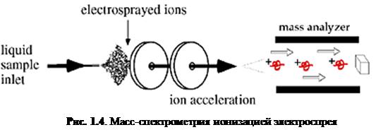Ионизация электроспрея – метод, который обычно применяется для пептидов, белков, углеводов, малых олигонуклеотидов, синтетических полимеров и липидов. ESI производит газообразные заряженные молекулы прямо из жидкого раствора. Ионизация происходит при создании тонкого спрея сильно заряженных капель в присутствии электрического поля. Образец раствора распыляется из области с сильным электрическим полем на конце металлической форсунки, поддерживаемой при потенциале между 700 и 5000 В. Форсунка (или игла), к которой приложен потенциал, служит для распыления раствора в тонкий спрей заряженных капель. Использование сухого газа, нагревания или оба этих способов применяется к заряженным каплям при атмосферном давлении для испарения из них растворителя. С уменьшением размера капель возрастает плотность заряда на их поверхности. Взаимное кулоновское отталкивание между одинаковыми зарядами на этой поверхности становится настолько велико, что превосходит силы поверхностного натяжения и ионы вырываются из капли через «конус Тейлора» - рис. 1.5. Другая возможность состоит в том, что капля взорвётся, высвобождая ионы. В любом случае свободные ионы направляются в канал через электростатические «линзы», направляясь в вакуум масс-анализатора. Так как ESI включает в себя непрерывную подачу раствора, он применим для использования совместно с ВЭЖХ или капиллярным электрофорезом.[4]