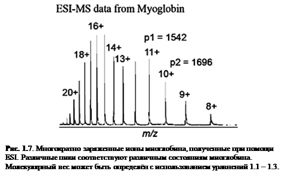Уравнения 1.2. и 1.3. могут быть решены для двух неизвестных, Mr и z1. Для пиков в масс-спектре миоглобина, показанном на рис. 1.9, p1=1542, p2=1696. | |