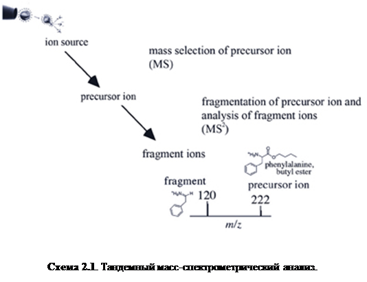 Термин «тандемный» анализ масс применяется для событий, последовательных в пространстве или во времени. Тандемный анализ масс в пространстве проводится последовательно расположенными анализаторами, тогда как тандемный во времени анализ масс осуществляется в одном и том же анализаторе, который отделяет нужный ион, фрагментирует его и анализирует фрагментарные ионы. Характеристики тандемного анализа для различных анализаторов приведены в таблице 2.2.
