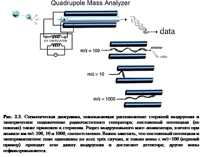 Квадрупольные анализаторы параллельно соединены с радиочастотным (RF) генератором и постоянной разностью потенциалов (DC). При определённой частоте RF, только ионы с соответствующим m/z могут пройти через квадруполь, как показано на рис. 2.3, где только ионы с m/z 100 детектируются. Во всех трёх случаях на рис. 2.3 DC и RF поля одинаковы. Поэтому сканированием RF поля может быть анализирован широкий m/z - диапазон (обычно от 100 до 4000) приблизительно за одну секунду.