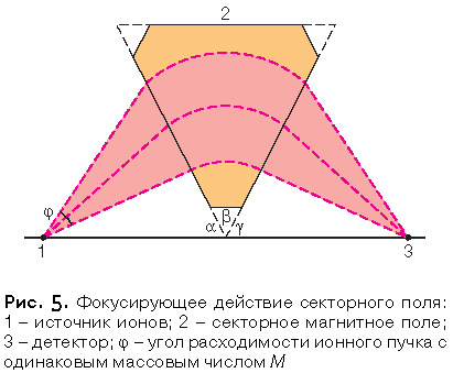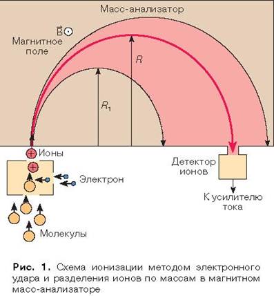 На рис. 1 приведена схема, иллюстрирующая принцип работы так называемого магнитного масс-спектрометра, в котором ионы разделяются под действием магнитного поля, с ионизацией посредством электронного удара.