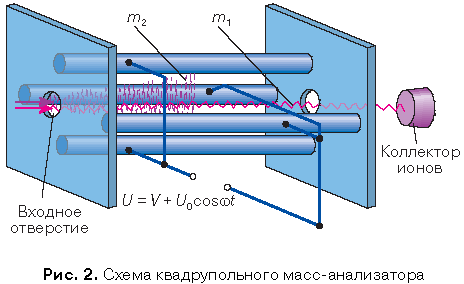 Комбинированное высокочастотное (несколько мегагерц) переменное и постоянное электрическое напряжение вида U = V + U0 cos ωt, подаваемое на систему четырех электродов (рис. 2), вынуждает ионы совершать колебательное движение в такт с частотой ω этого поля. При определенных величинах U0 , V и ω во выходную щель масс-анализатора будут проходить только ионы с определенной массой m, отвечающей условию: