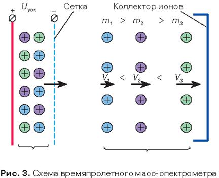 Еще один способ разделить ионы по массам – создать кратковременный импульс постоянного электрического поля (рис. 3). Приобретая скорость