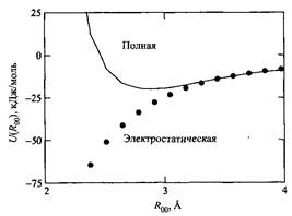 Энергия взаимодействия между двумя молекулами воды, рассчитанная неэмпирическим квантовомеханическим методом. Сплошная линия - полная энергия взаимодействия U. Точками показан вклад электростатической составляющей LreIe.