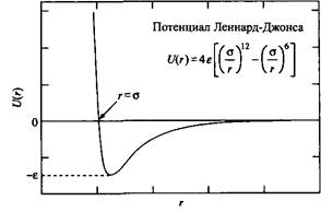 Схематическое представление потенциала Леннард-Джонса, где е - глубина минимума энергии притяжения, у - расстояние действия сил отталкивания