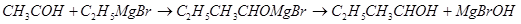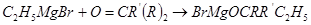 Благодаря этому смещению у атома углерода возникает некоторый положительный заряд, а у атома кислорода — дробный отрицательный заряд. В магнийгалогеналкиле R — MgBr остаток R ведет себя как нуклеофильная частица, легко присоединяющаяся к углеродному атому карбонильной группы. Реакция проходит по схеме