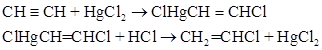 В газовой фазе процесс протекает на катализаторе хлорной ртути при температуре 160–2200С. В жидкой фазе при температуре 20–250С пропускают через концентрированный водный раствор соляной кислоты ацетилен. В качестве катализатора используют сулему. Процесс идет по следующим реакциям: