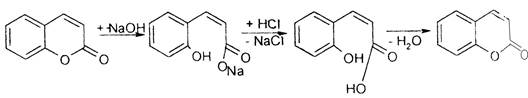 5. Водно-щелочной слой подкисляют разбавленной НСl. Происходит замыкание лактонного кольца, образуются кумарины, которые экстрагируют органическим растворителем.