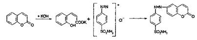 К спиртовому извлечению прибавляют 10% спиртовой раствор КОН, нагревают – раствор желтеет, прибавляют свежеприготовленный диазореактив (смесь равных объёмов пара-нитроанилина и раствора нитрита натрияв концентрированной НСl) при наличии кумаринов раствор приобретает окраску от коричневой до вишнёвой. Данный метод был применен для анализа кумаринов Heracleum sp., бергаптена в плодах Pastinaca sativa L., псоралена в субстанции и лекарственных препаратах, атамантина в корнях Peucedanum oreoselinum L. (Moench.), ксантотоксина и бергаптена в плодах Ammi majus L. и в препарате "Аммифурин".(11) (2):
