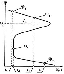 При катодной защите снижение скорости растворения металла происходит вследствие смещения потенциала в область значений, отрицательнее φкор. Например, если потенциал свободной коррозии φ1 металла располагается в области активного растворения (скорость растворения i1), то сдвиг потенциала в отрицательную сторону до значения φ3 приводит к снижению скорости растворения до величины i3, оказывающейся ниже i1. Аналогичное снижение скорости растворения металла происходит и в случае, когда потенциал свободной коррозии φ2 металла располагается в области перепассивации. При смещении потенциала в отрицательную сторону до величины φ4 скорость растворения снижается до i4. Различие заключается в том, что в первом случае снижение скорости растворения металла достигнуто без изменения характера его растворения — металл остался в активном состоянии. Во втором случае скорость растворения снизилась вследствие перехода металла из активного в пассивное состояние.