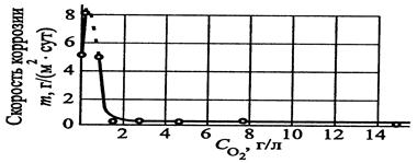 Поскольку величина критического тока пассивации сплавов Fe-Cr, к которым относятся и стали, существенно зависит от содержания в них хрома, ее эффективность возрастает с увеличением концентрации хрома в сплаве. Кислородная защита применяется при коррозии теплоэнергетического оборудования, эксплуатирующегося в воде при высоких параметрах (высокие температура и давление). На рис. представлена зависимость скорости коррозии низколегированной стали от концентрации кислорода в высокотемпературной воде. Как видно, увеличение концентрации растворенного в воде кислорода приводит к первоначальному росту скорости коррозии, последующему се снижению и дальнейшей стационарности. Низкие стационарные скорости растворения стали (в 10—30 раз ниже имеющих место без защиты) достигаются при содержании кислорода в воде ~ 1,8 г/л. Кислородная защита металлов нашла применение в атомной энергетике.