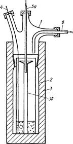 Гомогенный раствор, в состав которого входит родиевый комплекс, и высококипящие остатки от дистилляции, нагревают в реакторе, через который непрерывно проходит поток газа. На схеме применены следующие обозначения: 1 — верхняя часть стеклянного реактора; 2 нижняя часть стеклянного реактора; 3 — нагреватель; 4 — термопара; 5а — металлический капилляр со стеклянной входной трубкой; 56 — стеклянный капилляр; 6 — трубка для выхода продуктов. Все компоненты кубового остатка и продукты, образующиеся в результате пиролиза, выносятся из реактора током газа, а получающийся металл остается в реакционной камере.