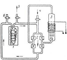Рис. 3 Проточно-циркуляционная система с электромагнитным поршневым насосом: 1— реактор в печи; 2 — клапан; 3— циркуляционный насос; 4—ввод исходной' газовой смеси; 5—выход реагирующей смеси за реактором; 6 выход реагирующей смеси до реактора.