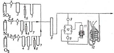 Рис. 4. Проточно-циркуляционная установка для окисления S02: 1—редуктор; 2—вентиль тонкой регулировки; 3 — барботер с H2SO4; 4—колонка с CuO; 5—колонка с ангидроном; 6—моностат с дибутил-фталатом; 7—реометр; 8—колонка с P2O5; 9—ловушка; 10 —клапанная коробка; 11 — циркуляционный насос; 12—реактор.