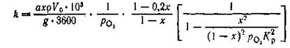 где а — исходная концентрация SО2, объемн.%; х — степень превращения, доли ед.; g — навеска катализатора, г; р — насыпная плотность катализатора, г/мл; V0 — скорость подачи газа, приведенная к нормальным условиям, дм3/ч; p — парциальное давление кислорода в исходном 'газе, кгс/см2; /Ср — константа равновесия, кгс/см2.