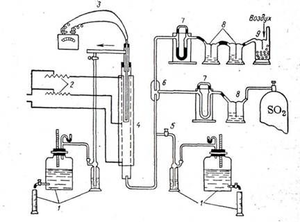 Рис. 5. Установка для окисления S02 во взвешенном слое катализатора: 1—прибор Рейха; 2—реостат; 3—пирометр; 4—контактный аппарат; 5—кран для отбора проб газа; 6—смеситель; 7—реометр; 8—склянка с H2SO4