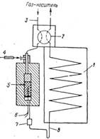 В импульсном каталитическом микрореакторе (рис. 6) через систему пропускают с постоянной скоростью газ-носитель (инертный газ или один из реагентов). В газ-носитель до реактора вводят реагент. Из реактора газ-носитель поступает в термостатированную колонку газового хроматографа и затем в детектор.